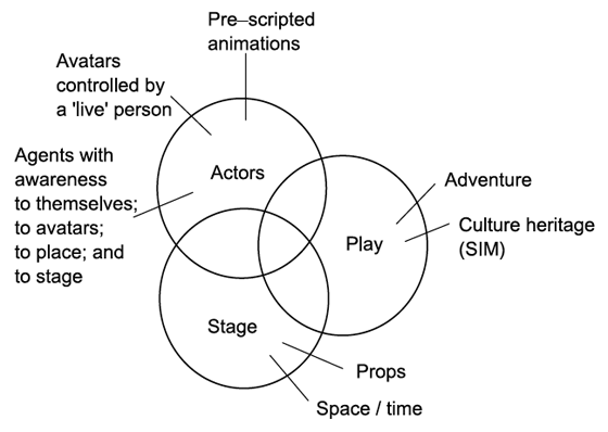 To help us navigate these differences, we chose to compare our virtual place-making to making stage-plays. These comprises a stage (a context), a narrative (the play), and actors (which include the audience, in different ways). The notion of place as a stage-play drives literary works, films, video games and architecture. It provides a framework for understanding the individual contributions of the components, and their mutual interactions. The following diagram illustrates the components and their relationships:
